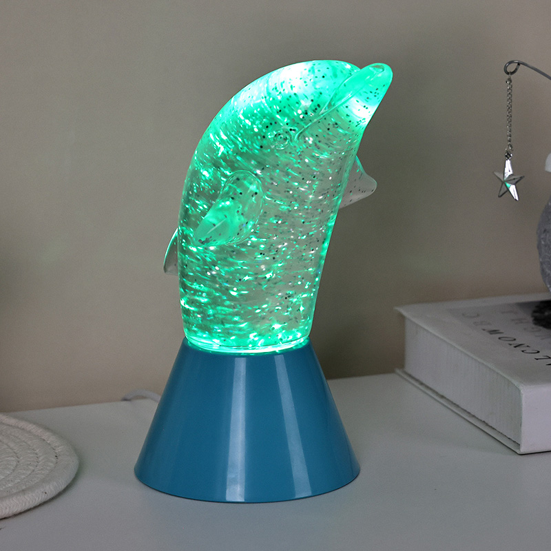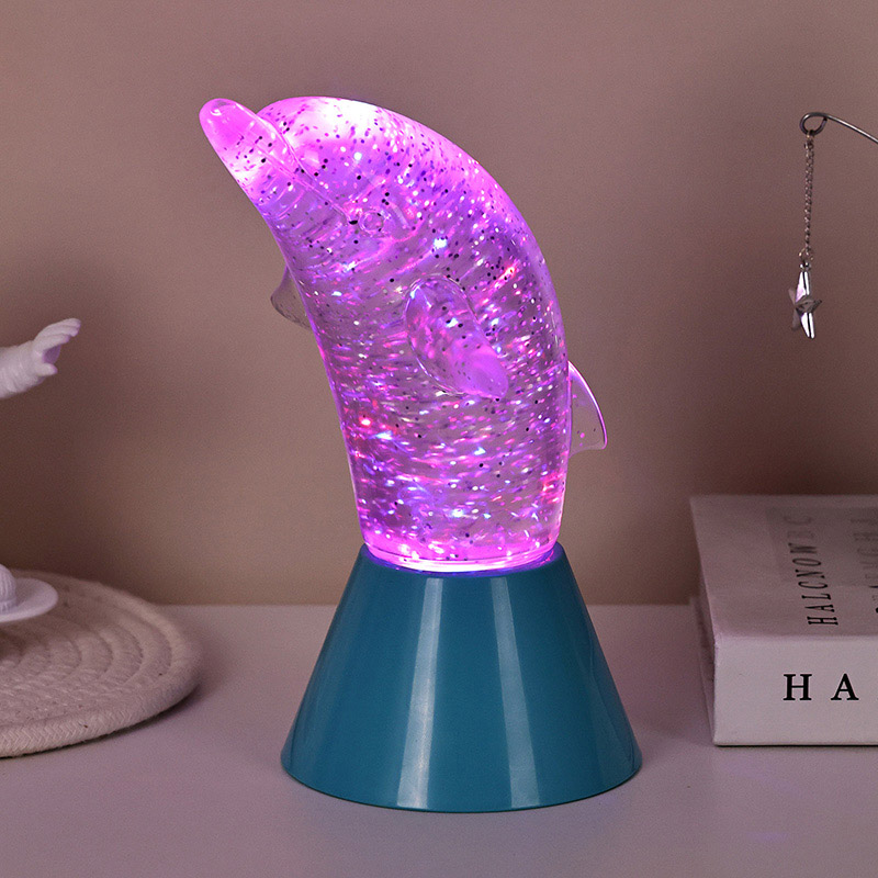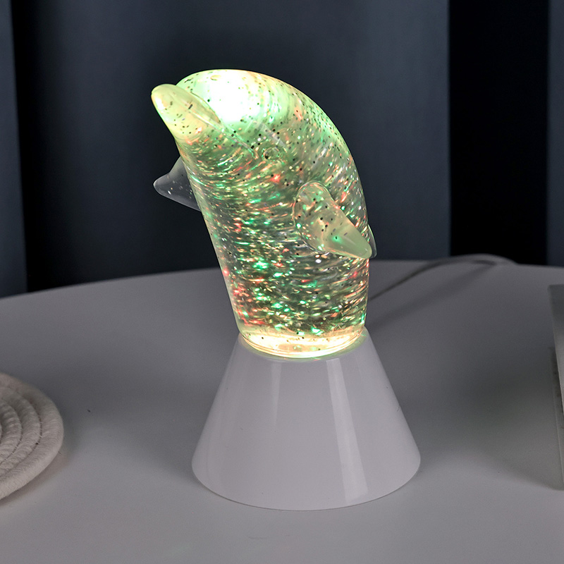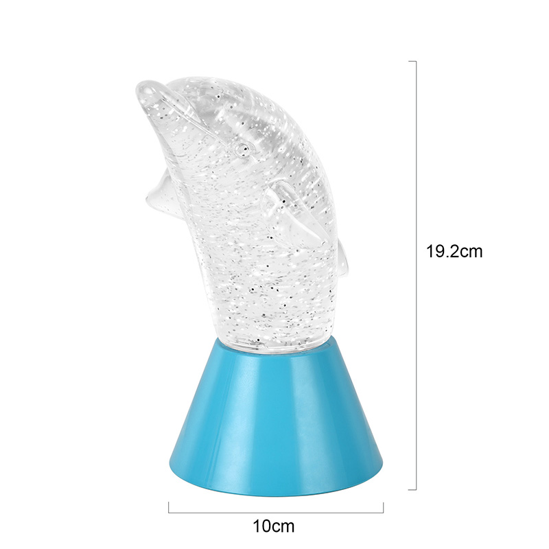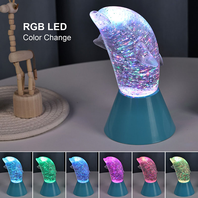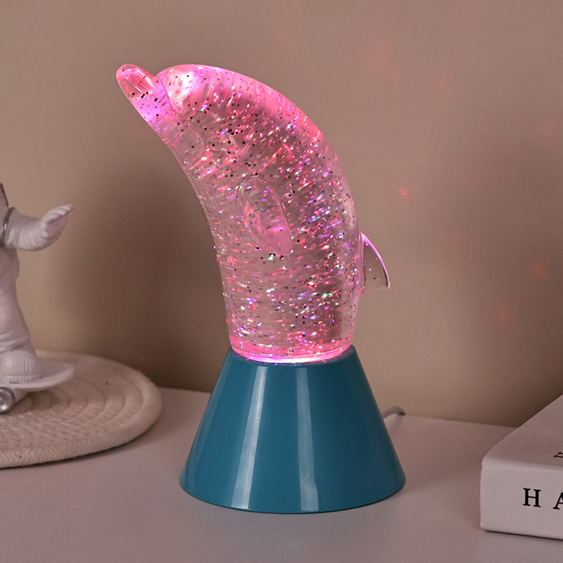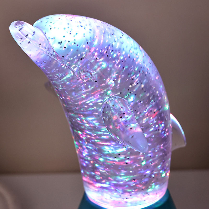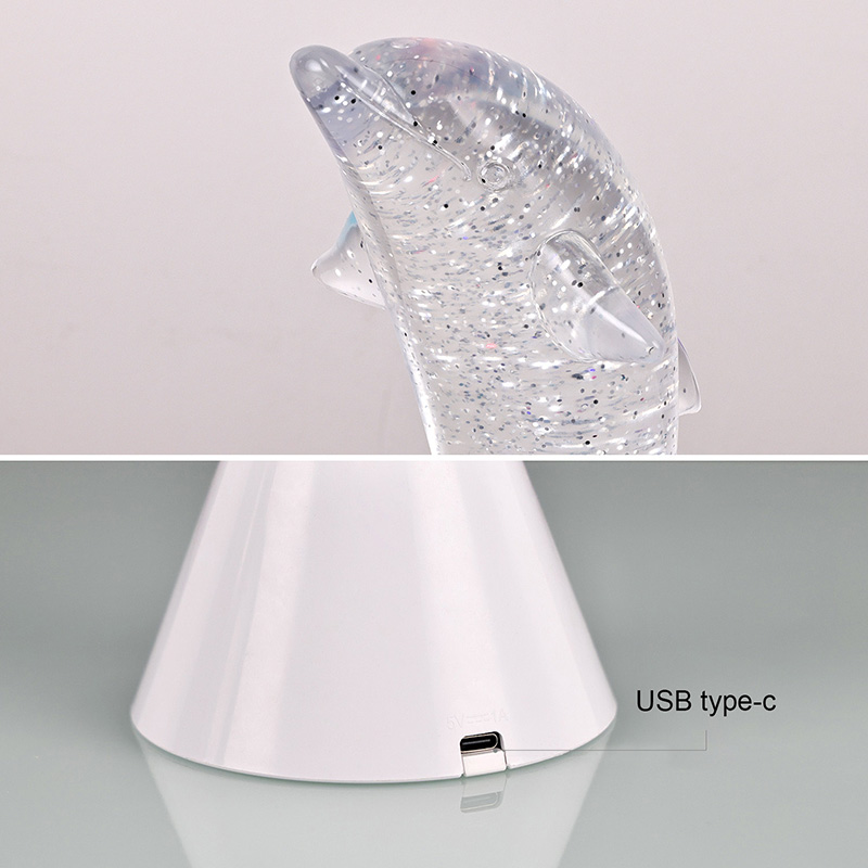 డాల్ఫిన్ కిడ్ గిఫ్ట్ గ్లిట్టర్ RGB నైలైట్ ఒక అందమైన డాల్ఫిన్ ఆకారంలో రూపొందించబడింది, మృదువైన గీతలు మరియు సున్నితమైన వివరాలతో డాల్ఫిన్ల చురుకైన భంగిమను సంపూర్ణంగా పునరుద్ధరిస్తుంది. పారదర్శక డాల్ఫిన్ షెల్ లోపల, సీక్విన్స్ ఆకారంలో క్రమరహిత కదలికలు రంగులను అందంగా ప్రతిబింబిస్తాయి, శాంతియుత మరియు రహస్యమైన వాతావరణాన్ని సృష్టిస్తాయి. మీరు ఈ దీపాన్ని చూసే ప్రతిసారీ, మీరు లోతైన సముద్రంలో ఉన్నట్లు అనిపిస్తుంది, అధునాతన RGB రంగు మారుతున్న లైటింగ్ టెక్నాలజీతో కూడిన ప్రకృతి యొక్క అనంతమైన మనోజ్ఞతను అనుభూతి చెందండి, తద్వారా మీరు బహుళ రంగుల మధ్య స్వేచ్ఛగా మారవచ్చు. అది వెచ్చని నారింజ, శృంగార గులాబీ లేదా నిర్మలమైన నీలి రంగు అయినా,