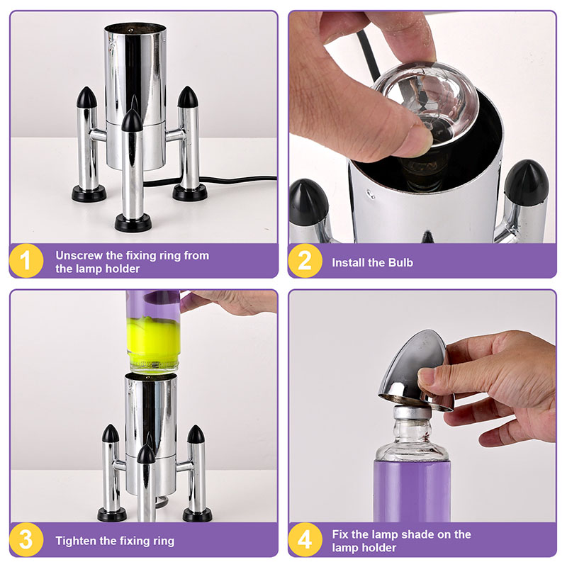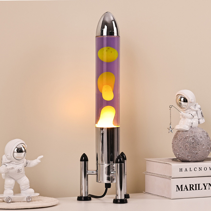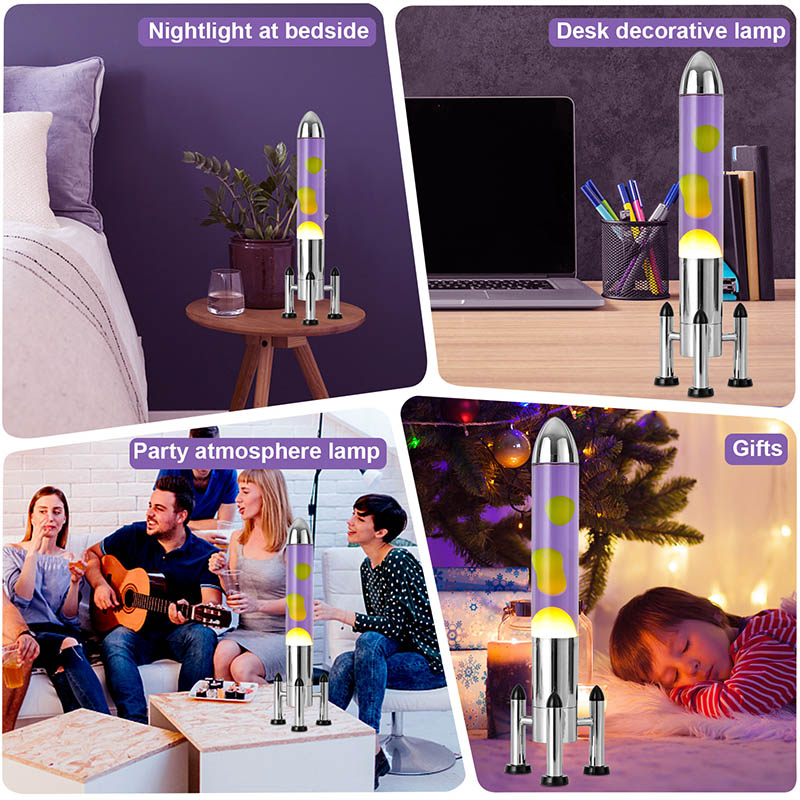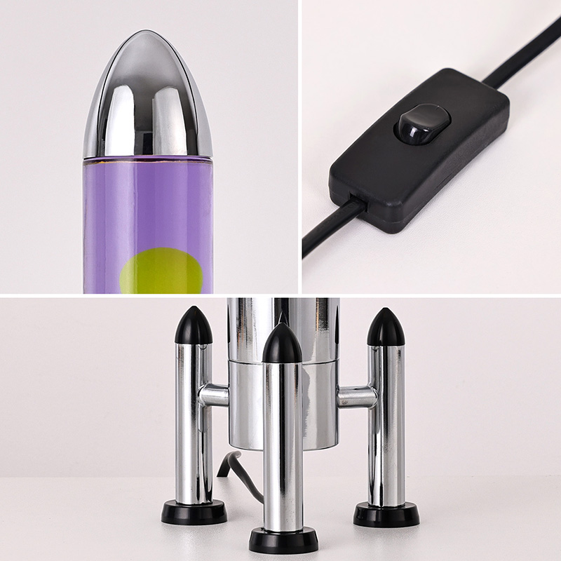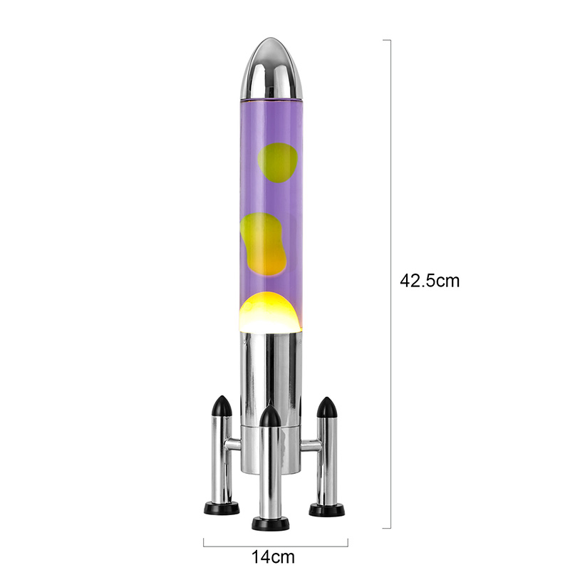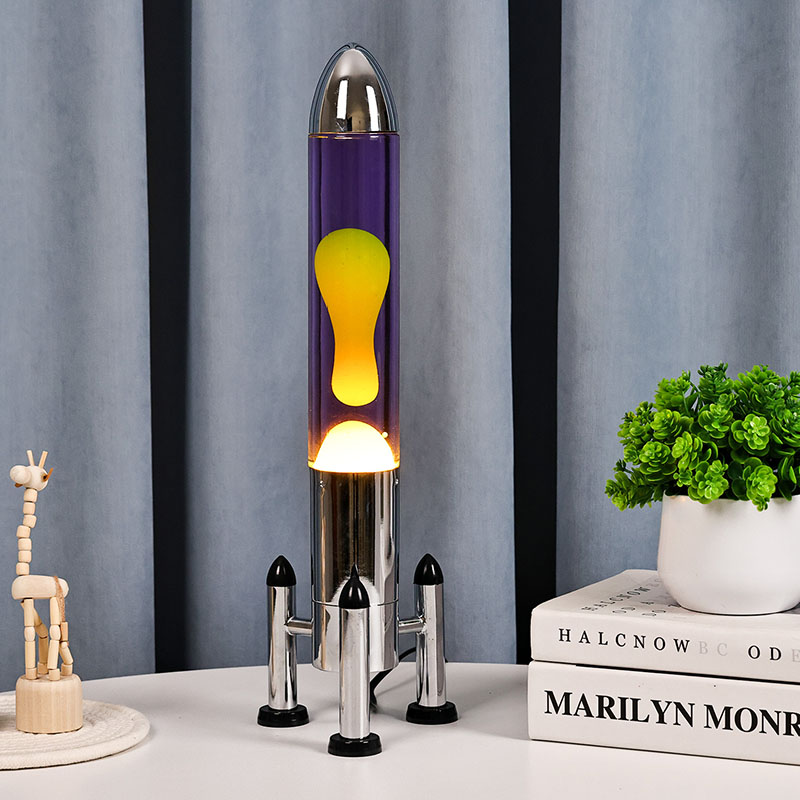 24Vరాకెట్ షేడ్తో కూడిన పెద్ద LED లావా ల్యాంప్ క్లాసిక్ రాకెట్ ఆకారపు డిజైన్ను కలిగి ఉంది, సిల్వర్ మెటల్ షెల్తో పారదర్శక గాజు బాటిల్ బాడీతో జత చేయబడింది, సాధారణ ఇంకా స్టైలిష్. లోపల ఊదా ద్రవంలో పసుపు తేలుతుంది