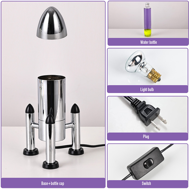 పిల్లలకు ఆటబొమ్మలా లేదా పెద్దలకు అలంకారమైన ఈ రాకెట్ ఆకారపు ఊదా రంగు నీటి పసుపు మైనపు దీపం మీ జీవితంలో ఒక ప్రకాశవంతమైన ప్రదేశంగా మారుతుంది. దాని ప్రత్యేక డిజైన్ దాని మంత్రముగ్ధులను చేసే ప్రకాశంతో, ఇది మీ ఇంటి వాతావరణానికి ఆహ్లాదాన్ని మరియు ఉత్సాహాన్ని జోడించడమే కాకుండా, మీకు మరియు మీ కుటుంబం మరియు స్నేహితుల మధ్య సంభాషణకు కేంద్ర బిందువుగా మారుతుంది.