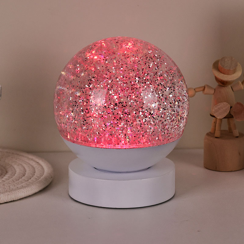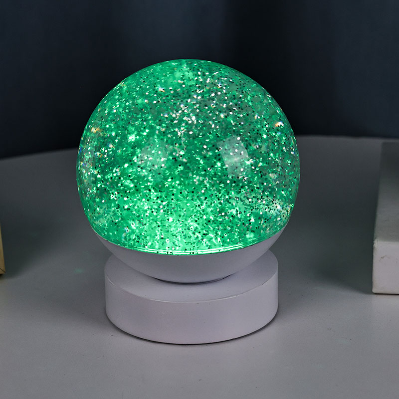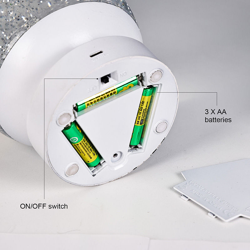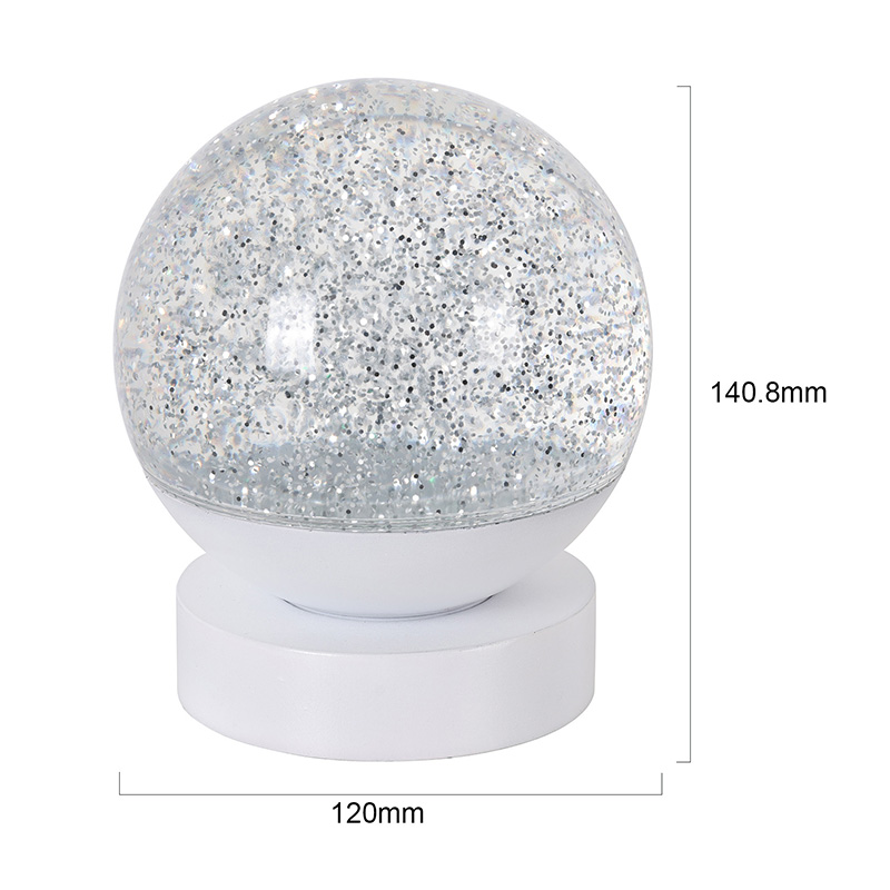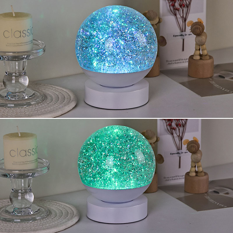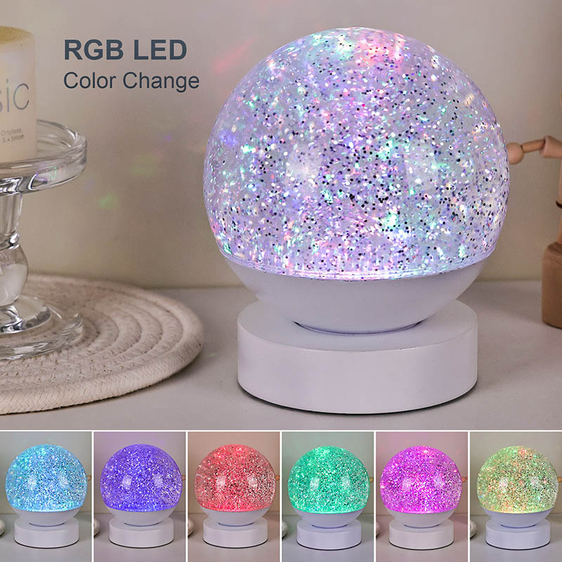 లెడ్ RGB గ్లిట్టర్ డెకర్ లాంప్ అధిక-నాణ్యత యాక్రిలిక్ పదార్థంతో తయారు చేయబడింది, అద్భుతమైన కాంతి ప్రసారంతో అపారదర్శక గోళాన్ని కలిగి ఉంటుంది. ఆధారం పర్యావరణ అనుకూలమైన ABS ప్లాస్టిక్తో రూపొందించబడింది, విషపూరిత పదార్థాలు లేకుండా స్థిరత్వం, మన్నిక మరియు భద్రతను నిర్ధారిస్తుంది. ఇది మూడు అంతర్నిర్మిత AAA బ్యాటరీలపై పనిచేస్తుంది (బ్యాటరీలు విడివిడిగా విక్రయించబడతాయి), పవర్ అవుట్లెట్ అవసరాన్ని తొలగిస్తుంది మరియు అనుకూలమైన వినియోగాన్ని అందిస్తుంది. మంచం, డెస్క్ లేదా పిల్లల బొమ్మల మూలలో ఉంచడానికి పర్ఫెక్ట్. ఒక సాధారణ టచ్ స్విచ్తో, లైట్ను సులభంగా ఆన్ లేదా ఆఫ్ చేయవచ్చు, ఇది పిల్లలు స్వతంత్రంగా పనిచేయడానికి కూడా యూజర్ ఫ్రెండ్లీగా చేస్తుంది.