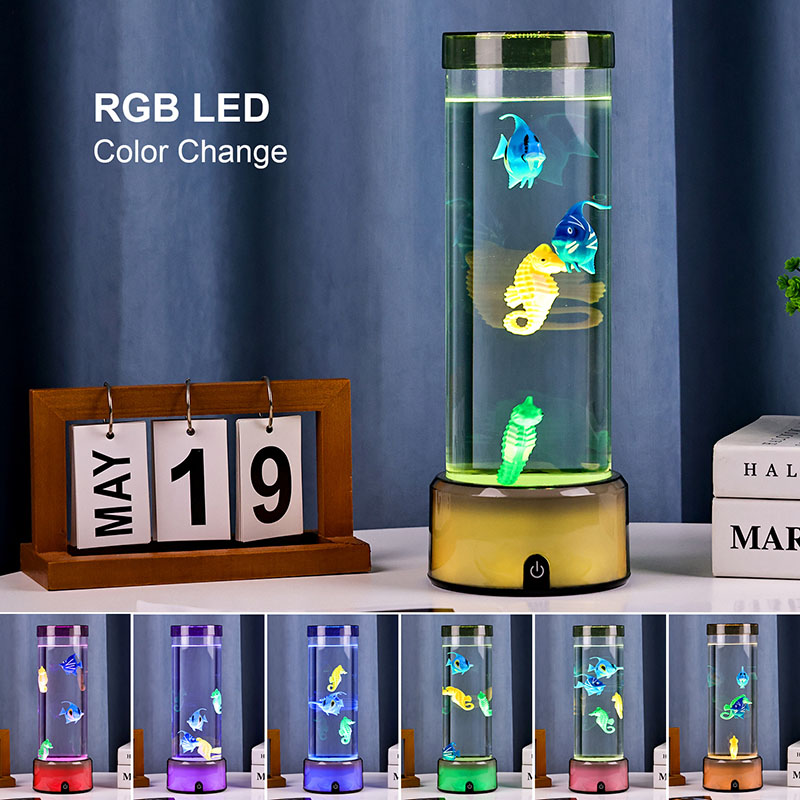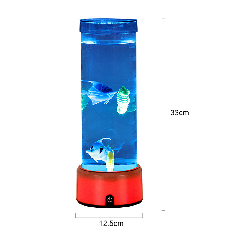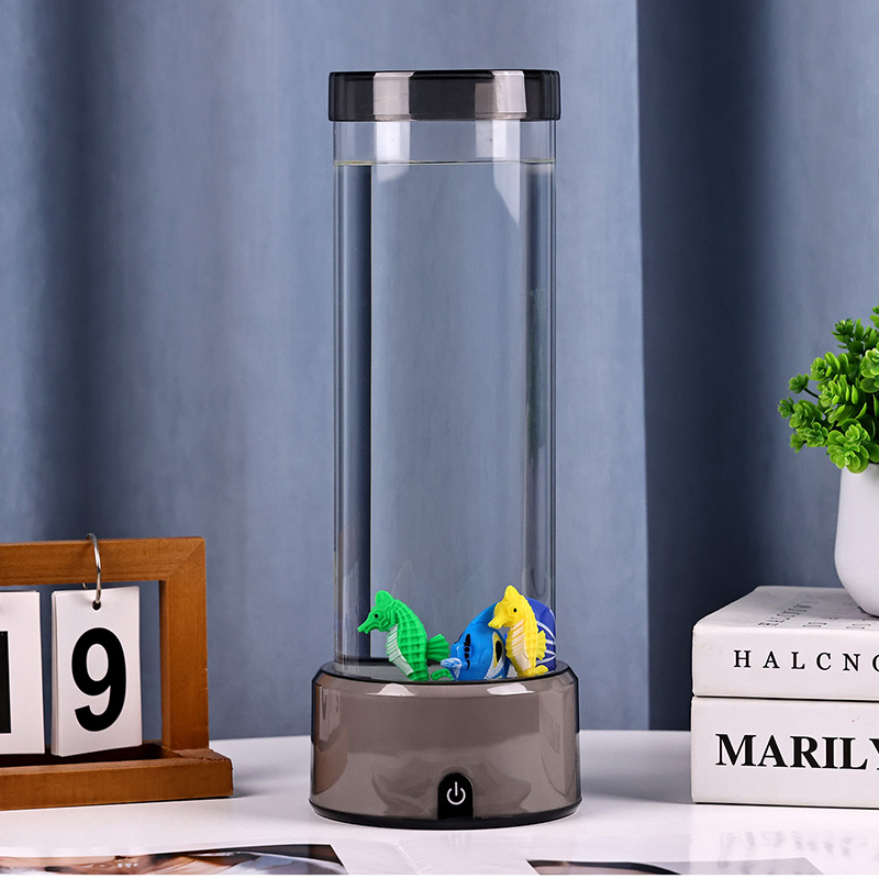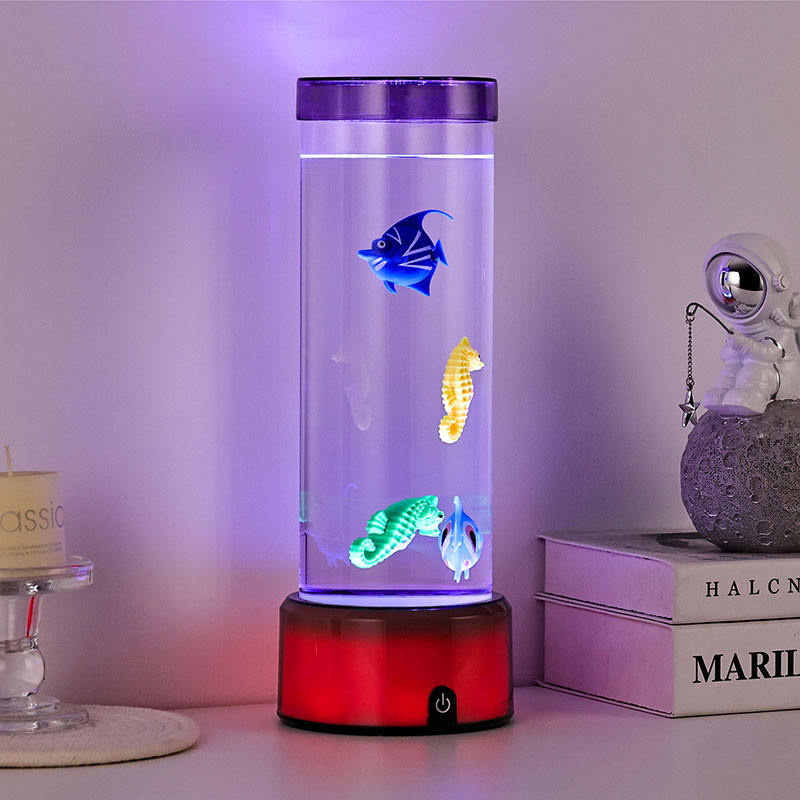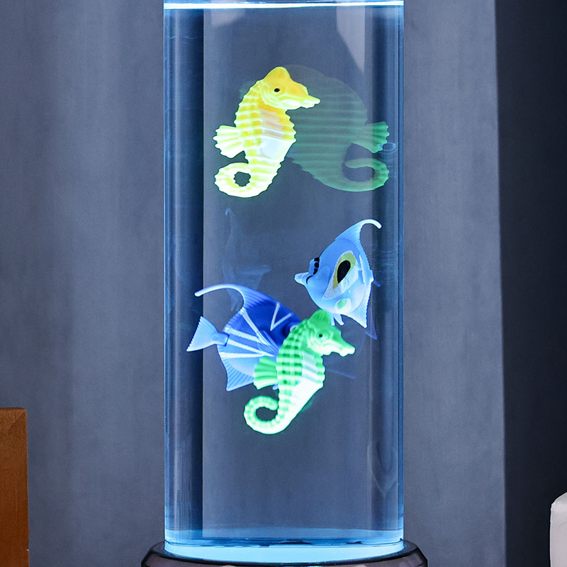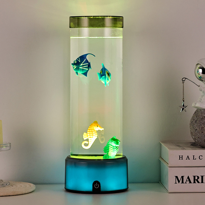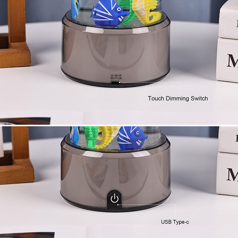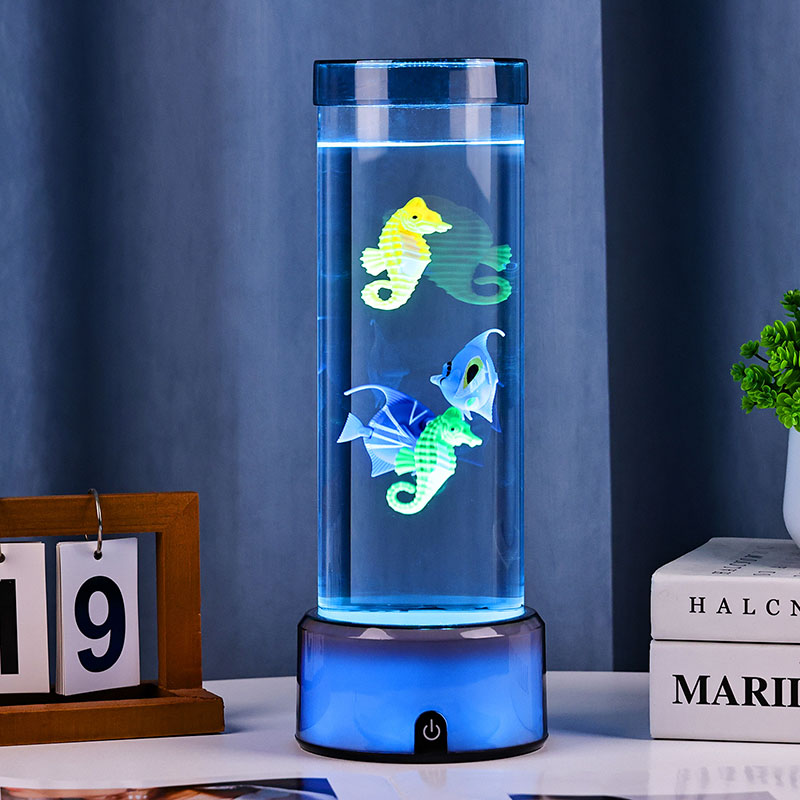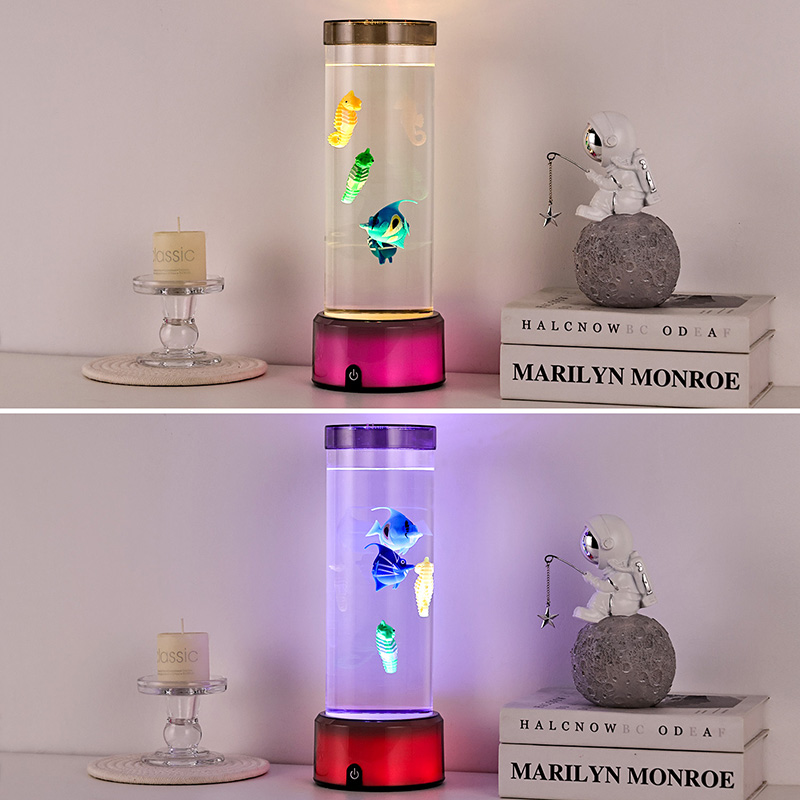 ఆకర్షణ. అధిక-నాణ్యత, మన్నికైన ప్లాస్టిక్తో రూపొందించబడిన ఈ ఆకర్షణీయమైన ల్యాంప్ స్పష్టమైన ద్రవంతో నిండిన సొగసైన స్థూపాకార శరీరాన్ని కలిగి ఉంటుంది మరియు శక్తివంతమైన ఉష్ణమండల చేపలు మరియు మనోహరమైన సముద్ర గుర్రంతో సహా అందమైన వివరణాత్మక తేలియాడే చేపల బొమ్మలు-నిశ్చలమైన, జీవసంబంధమైన సముద్ర దృశ్యాన్ని సృష్టిస్తుంది, ఇది ఏ గదికైనా ప్రశాంతతను మరియు దృశ్యమాన ఆనందాన్ని ఇస్తుంది.