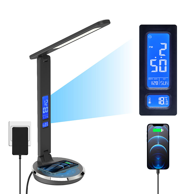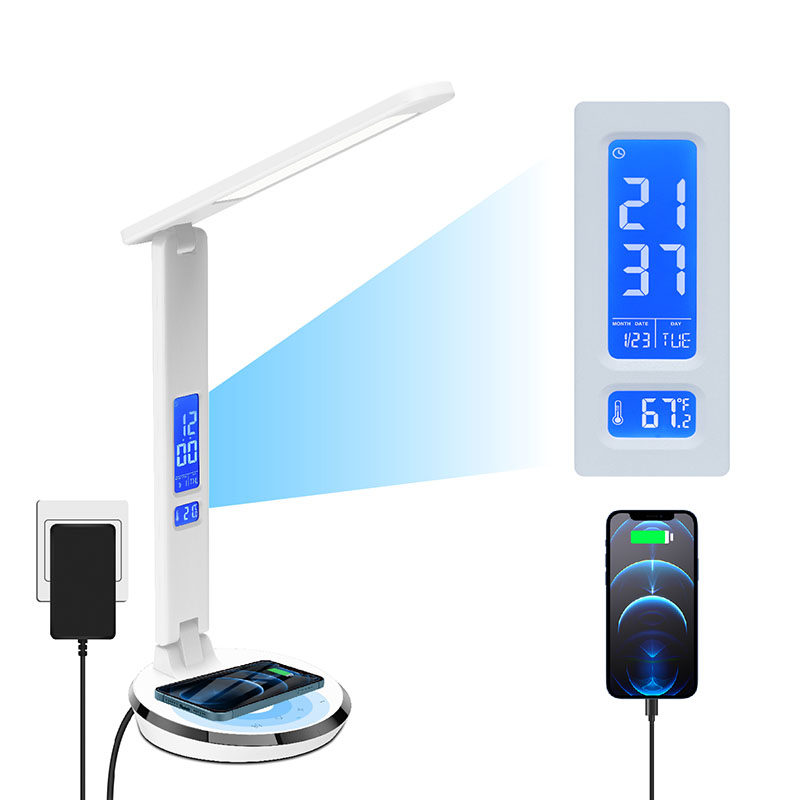 ఉష్ణోగ్రత ప్రదర్శన, సమయం, అలారం గడియారం, బ్యాక్ బాడీ కంట్రోల్ బటన్తో శాశ్వత క్యాలెండర్తో LCD స్క్రీన్ ఉంది. మరియు డెస్క్ ల్యాంప్ షేడ్ వెనుక USB ఛార్జ్ పోర్ట్ ఉంది.