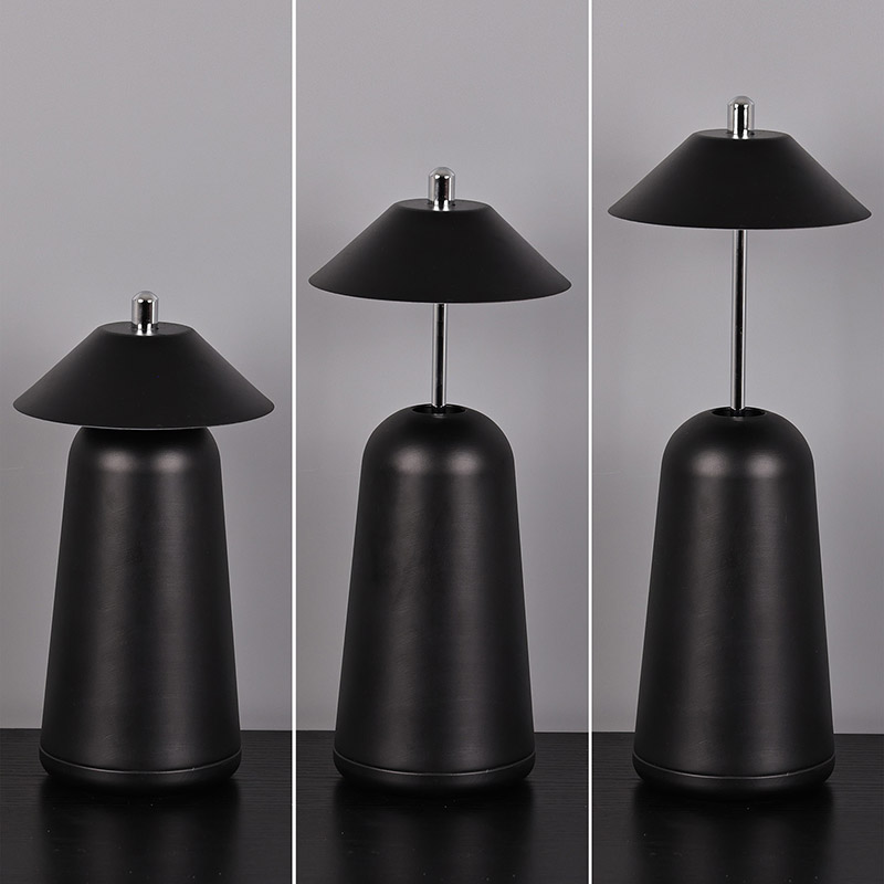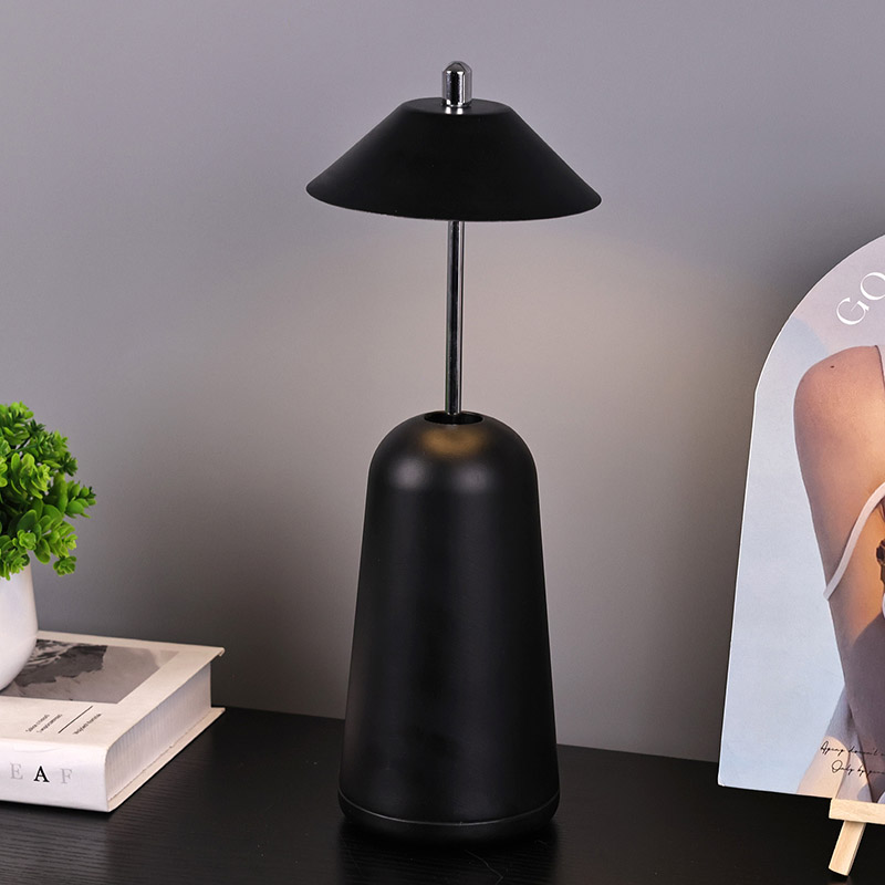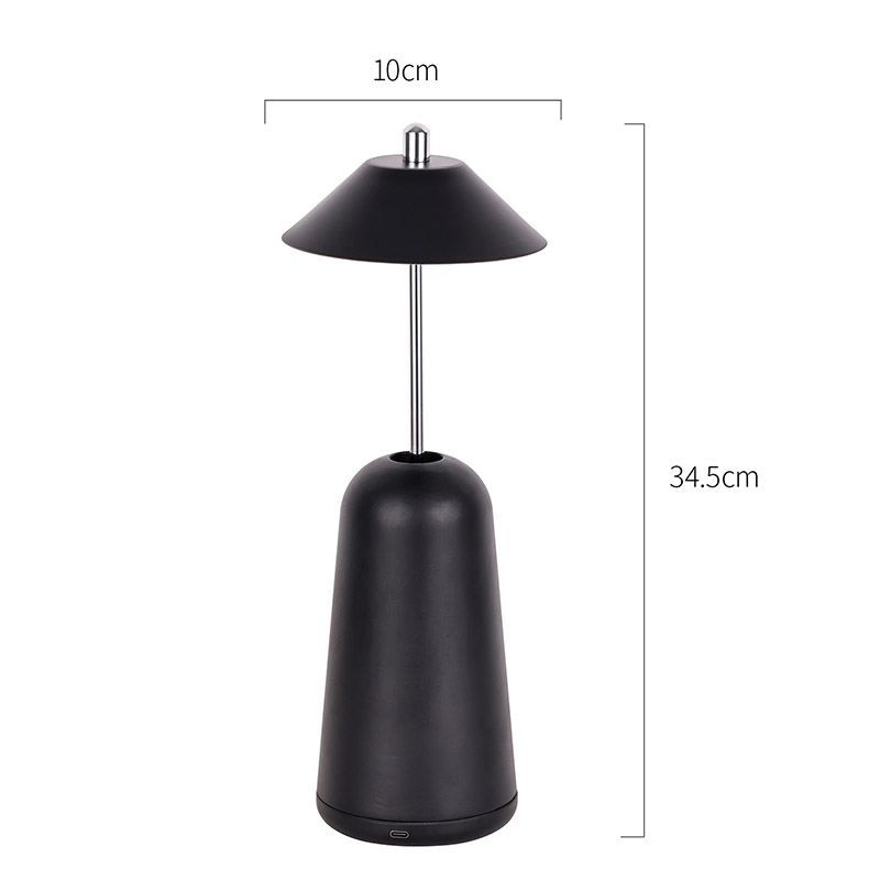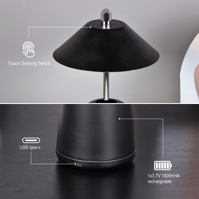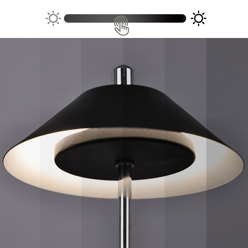 అడ్జస్ట్ హైట్ షేడ్తో ఆధునిక లెడ్ డెస్క్ ల్యాంప్ యొక్క కాంతి అంతర్గతంగా లాంప్షేడ్లో కత్తిరించబడింది, వెచ్చని రంగులు మరియు మూడు స్థాయిల కాంతి తీవ్రత 3000K నుండి 6500K వరకు ఉంటుంది. లాంప్షేడ్ పైభాగం యాంటెన్నా మాదిరిగానే టచ్ స్విచ్. ఆధారం క్రమరహిత స్థూపాకార లోహంతో కూడి ఉంటుంది