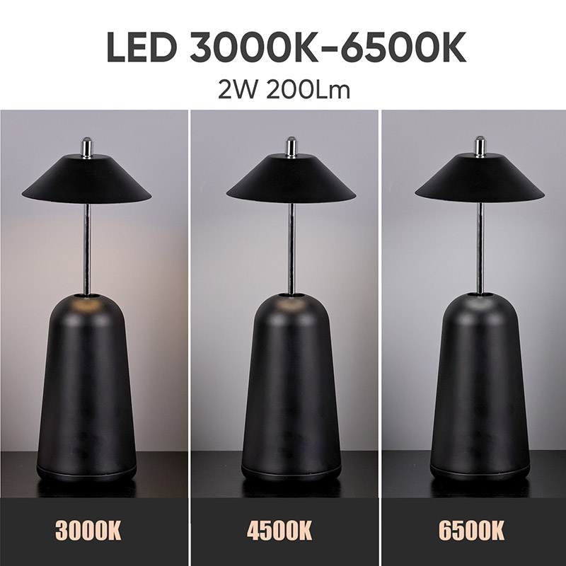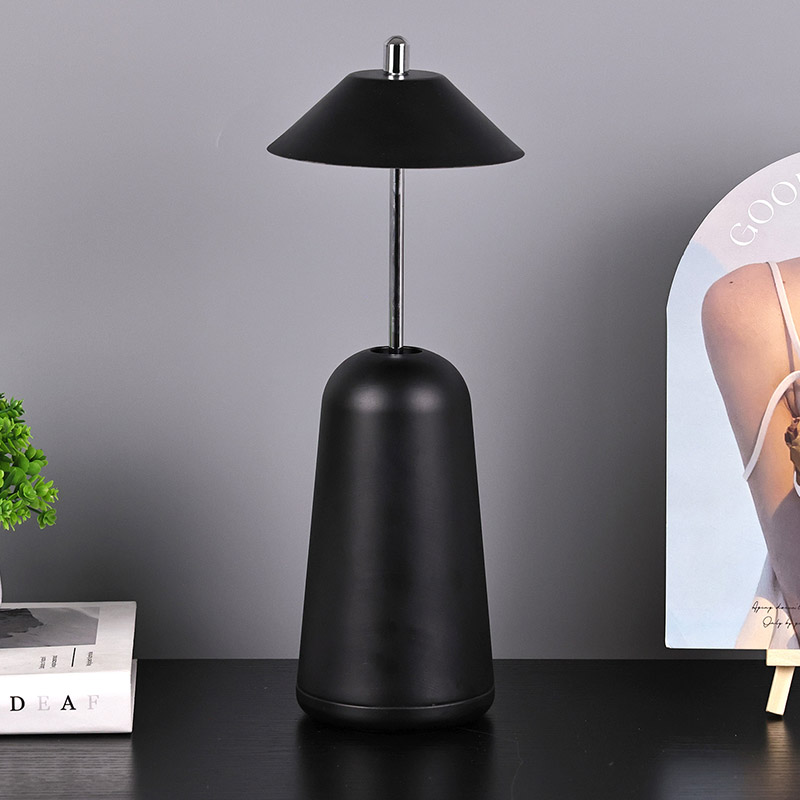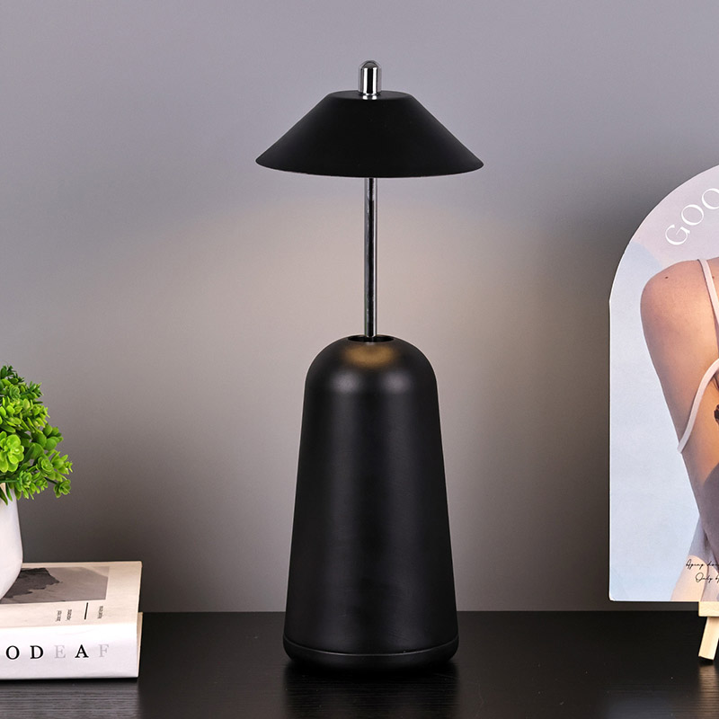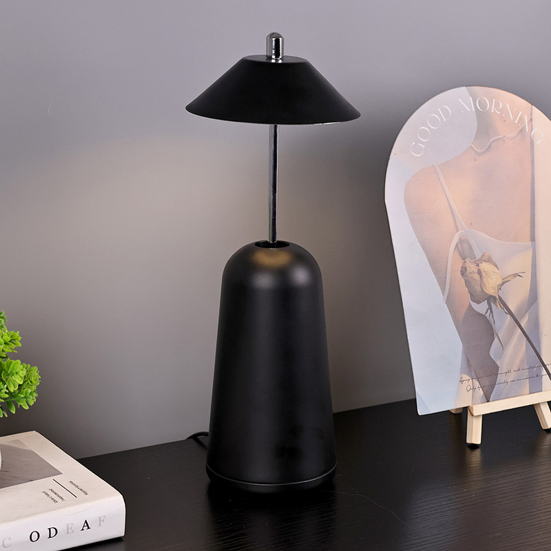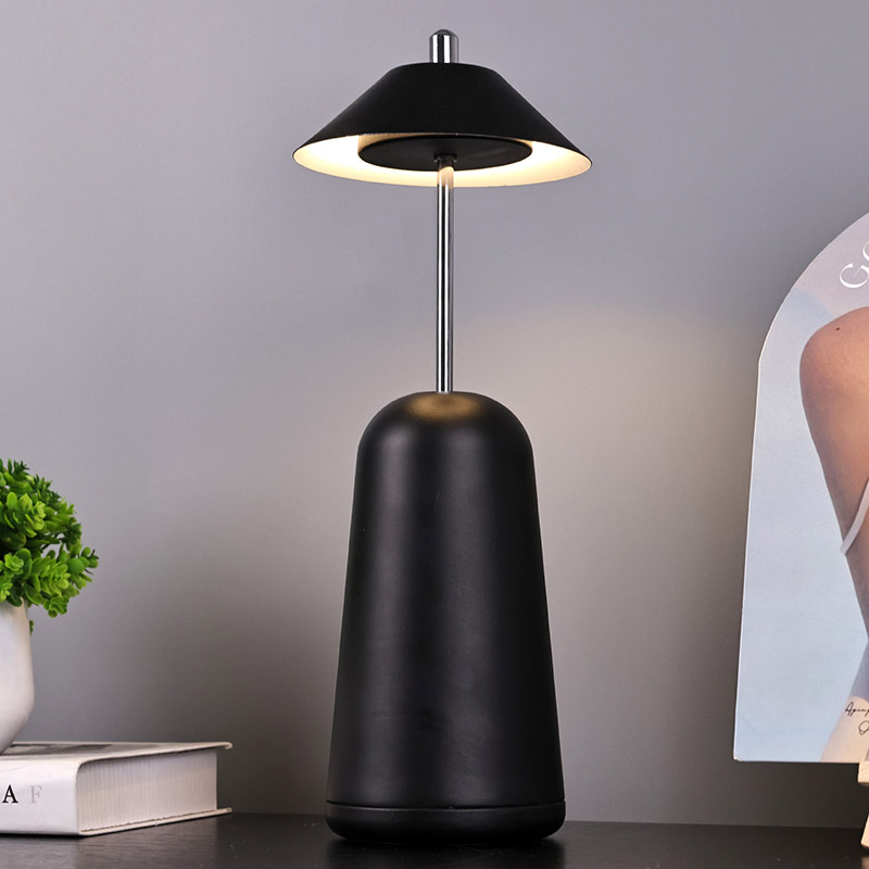 అడ్జస్ట్ హైట్ షేడ్తో ఆధునిక లెడ్ డెస్క్ ల్యాంప్ యొక్క కాంతి అంతర్గతంగా లాంప్షేడ్లో కత్తిరించబడింది, వెచ్చని రంగులు మరియు మూడు స్థాయిల కాంతి తీవ్రత 3000K నుండి 6500K వరకు ఉంటుంది. లాంప్షేడ్ పైభాగం యాంటెన్నా మాదిరిగానే టచ్ స్విచ్. ఆధారం క్రమరహిత స్థూపాకార లోహంతో కూడి ఉంటుంది