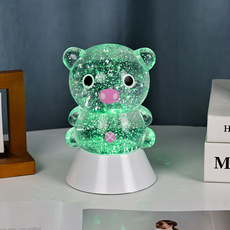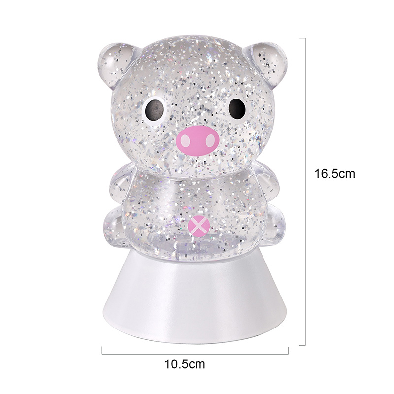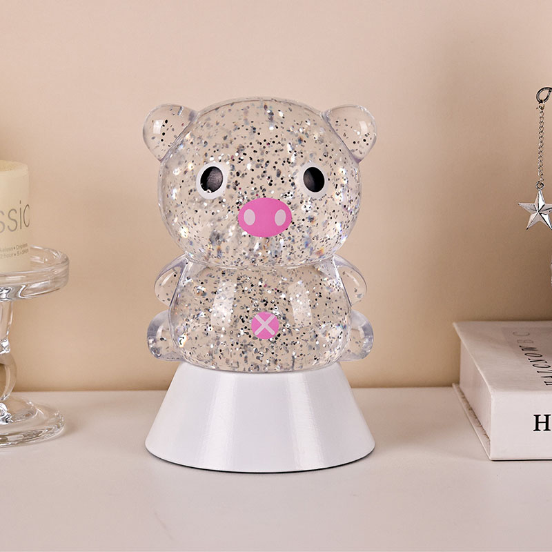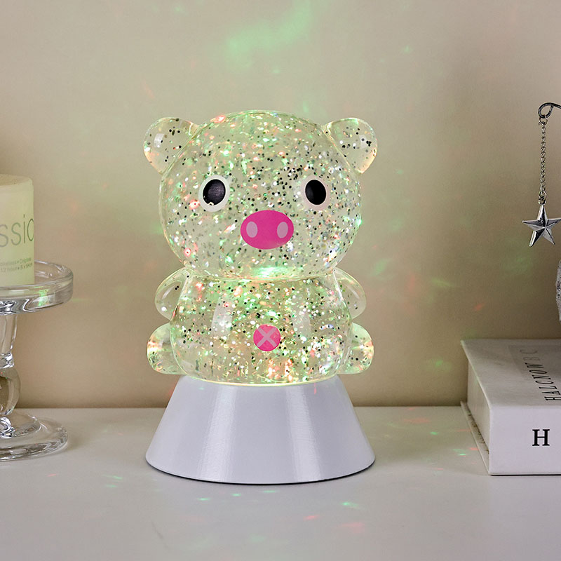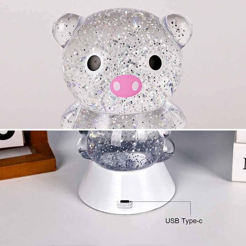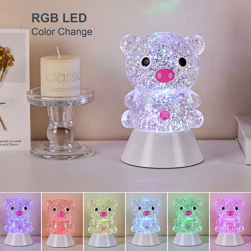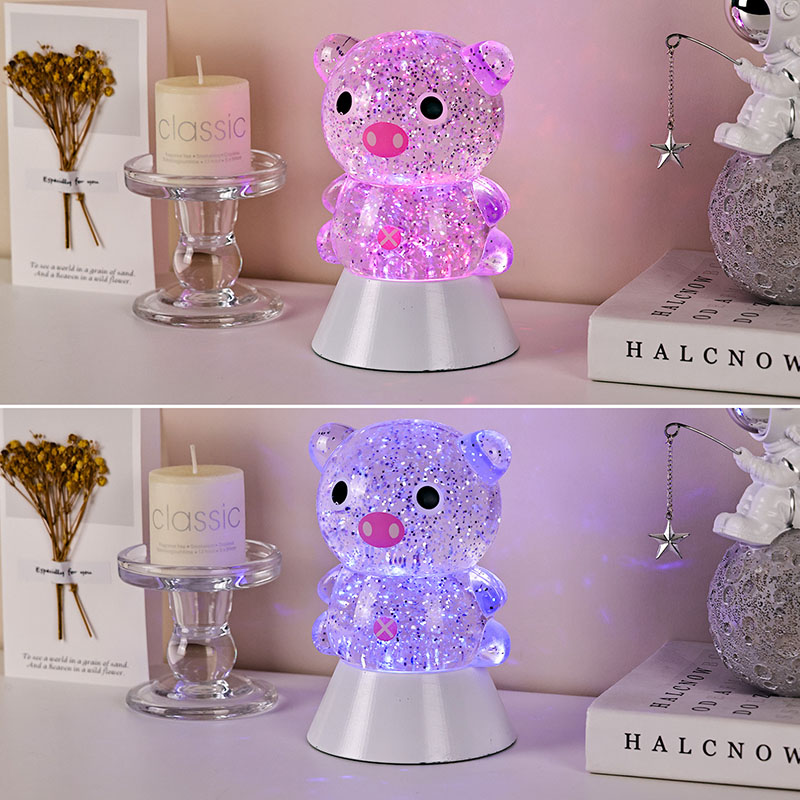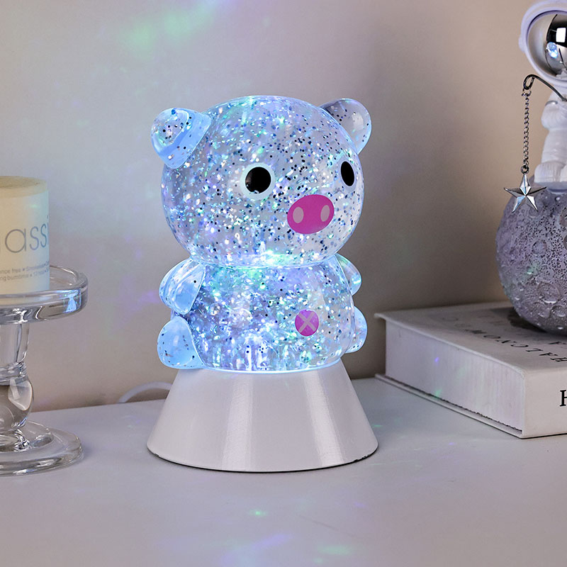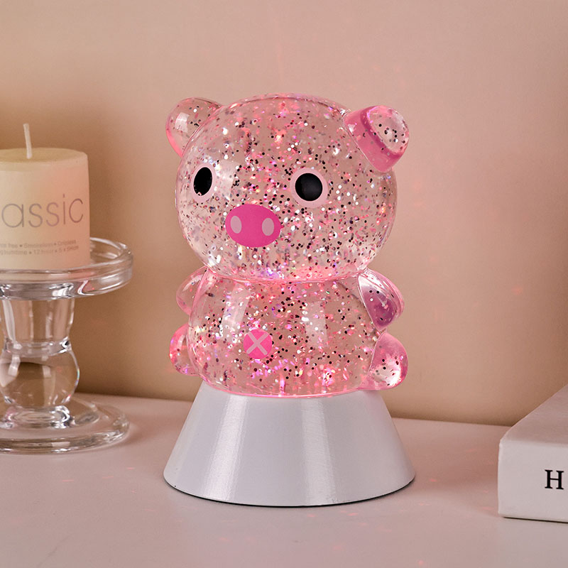 మొత్తం డిజైన్లో అందమైన మరియు ఆరాధనీయమైన పిగ్గీ ఇమేజ్ని కలిగి ఉంది, దాని గుండ్రని మరియు బొద్దుగా ఉండే ఆకృతులను పెద్ద కళ్ళు, గులాబీ ముక్కు మరియు పూజ్యమైన చిన్న చెవులతో జత చేసి, పెద్దలు మరియు పిల్లల హృదయాలను తక్షణమే బంధిస్తుంది. పారదర్శక రెసిన్ షెల్ మెరిసే రంగు సీక్విన్స్ మరియు ప్రత్యేక ద్రవంతో నిండి ఉంటుంది, ఇది లైట్లు ఆన్ చేసినప్పుడు ద్రవంతో మెల్లగా ప్రవహిస్తుంది, పిగ్గీ శరీరంలో ప్రవహించే నక్షత్రాల నది వంటి కలలు కనే దృశ్య ప్రభావాన్ని సృష్టిస్తుంది. లేత రంగులు స్వయంచాలకంగా తిరుగుతాయి, మృదువైన గులాబీ మరియు కలలు కనే ఊదారంగు నుండి తాజా నీలం మరియు ఆకుపచ్చ రంగులకు మారుతూ, అద్భుత కథల ప్రపంచాన్ని వాస్తవంలోకి తీసుకువస్తున్నట్లుగా, ప్రశాంతమైన ఇంకా అద్భుత వాతావరణాన్ని సృష్టించే రంగుల ఇంద్రధనస్సుగా నిరంతరం మారుతూ ఉంటాయి.