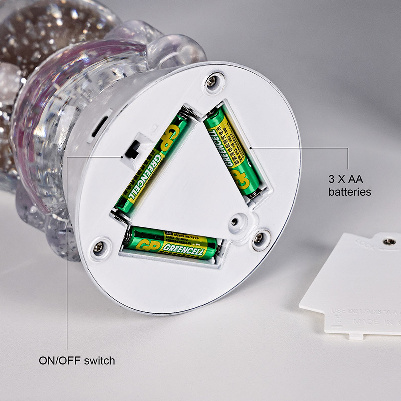 పిగ్ షేడ్ RGB గ్లిట్టర్ టేబుల్ ల్యాంప్ దిగువ భాగంలో సరళమైన మరియు సొగసైన తెల్లటి బేస్ డిజైన్ను కలిగి ఉంది, ఇది మొత్తం సౌందర్యాన్ని మెరుగుపరచడమే కాకుండా టిప్పింగ్ నిరోధించడానికి స్థిరత్వాన్ని మెరుగుపరుస్తుంది. బేస్ అంతర్గత బ్యాటరీ కంపార్ట్మెంట్ను కలిగి ఉంది, ఇక్కడ వినియోగదారులు మూడు AAA బ్యాటరీలను సులభంగా ఇన్స్టాల్ చేయవచ్చు (చేర్చబడలేదు). ప్లగ్ ఇన్ అవసరం లేకుండా, ఇది పోర్టబిలిటీని అందిస్తుంది మరియు మంచం, డెస్క్, తొట్టి లేదా ప్రయాణ సమయంలో ఉంచడానికి అనువైనది. స్విచ్ డిజైన్ వినియోగదారు-స్నేహపూర్వకంగా ఉంటుంది, సాధారణ టచ్తో సులభంగా ఆన్/ఆఫ్ కంట్రోల్ని అనుమతిస్తుంది, దీన్ని సురక్షితంగా మరియు సూటిగా ఆపరేట్ చేయడం-ముఖ్యంగా పిల్లలు స్వతంత్రంగా ఉపయోగించడానికి అనుకూలంగా ఉంటుంది.