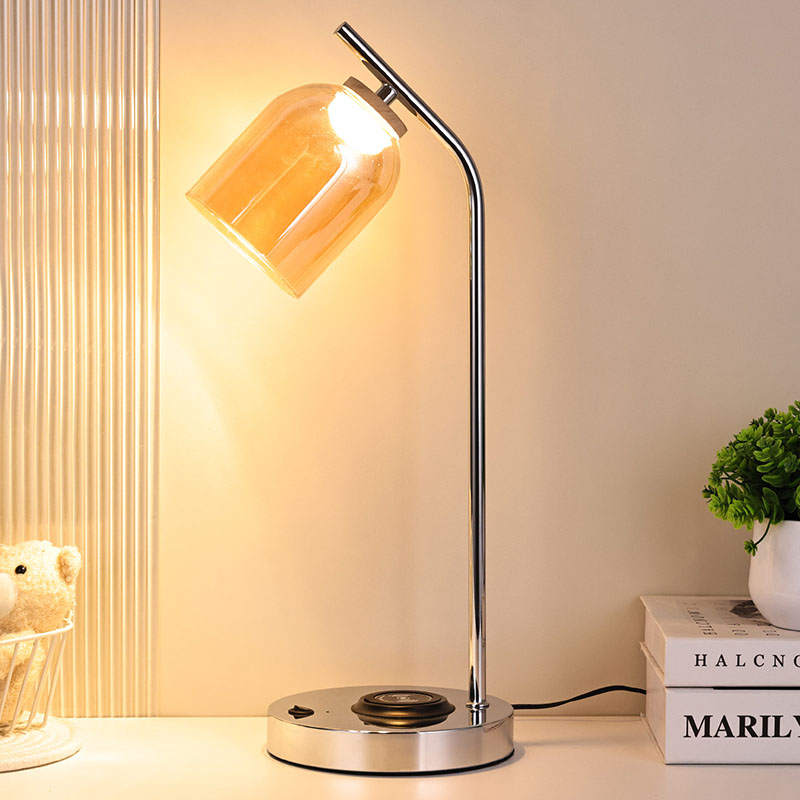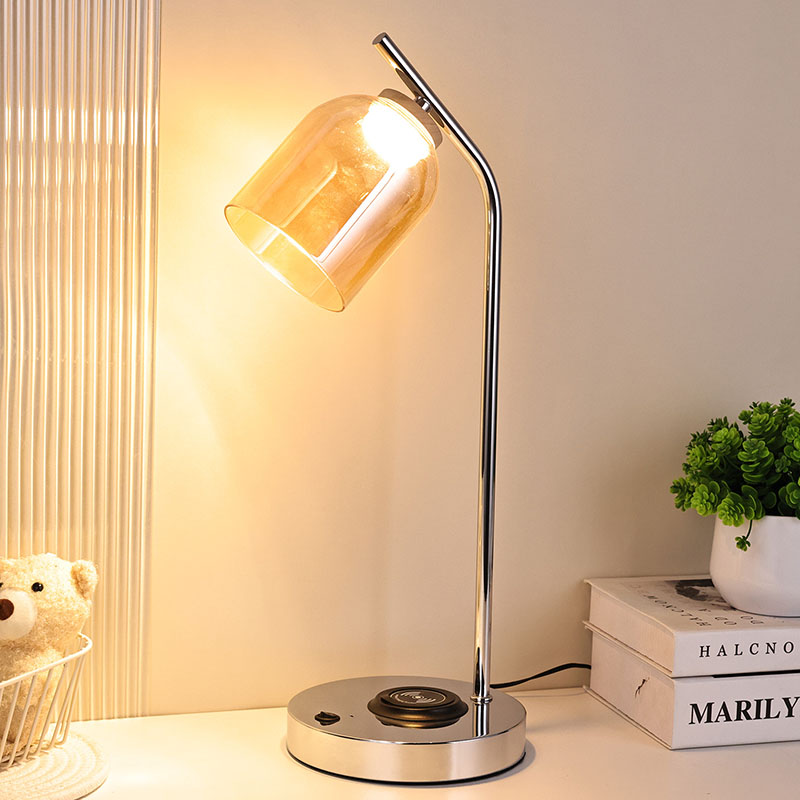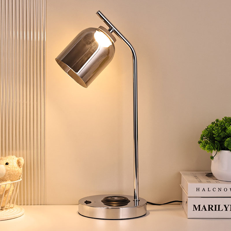 మెటల్ స్లివర్ బేస్ మరియు బాడీతో గ్లాస్ షేడ్తో QI లెడ్ డెస్క్ ల్యాంప్
