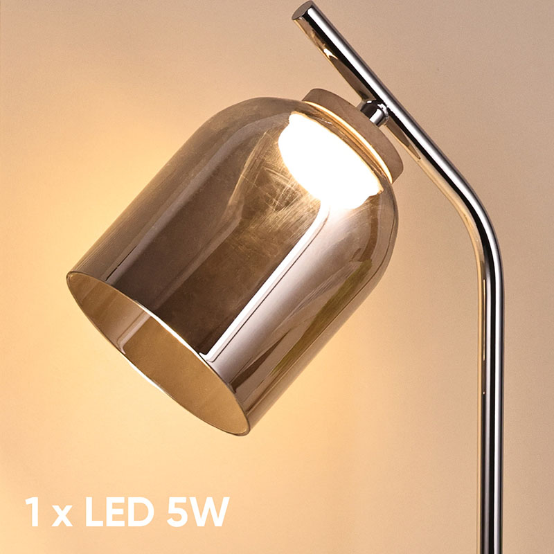 క్రోమ్ బేస్, స్మోకీ(అంబర్) గాజు నీడవినూత్న డిజైన్, గ్లాస్ మెటీరియల్, హై-ఎండ్ మరియు సొగసైన ప్రదర్శన, అత్యంత అలంకారమైన డెస్క్ ల్యాంప్ డిజైన్ శైలి