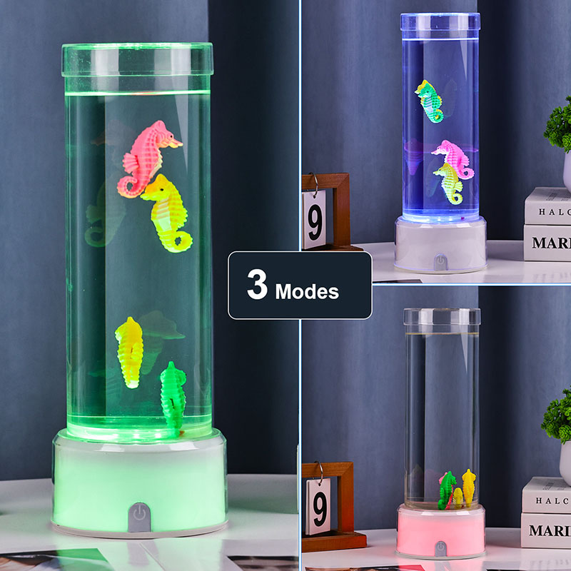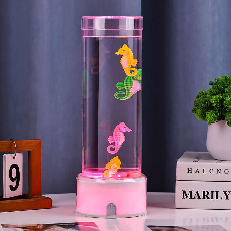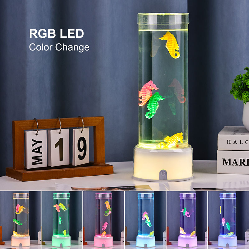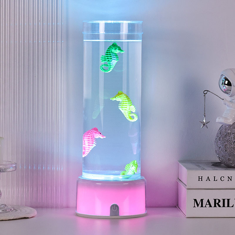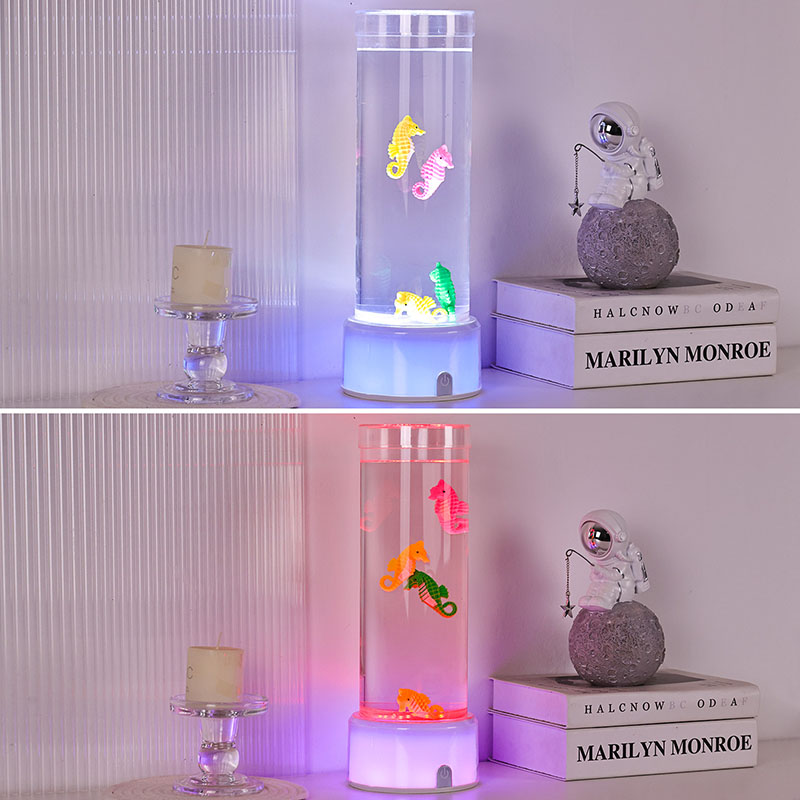 RGB రంగు మార్చే సముద్ర గుర్రం డెకరేటివ్ లాంప్ను పరిచయం చేస్తోంది, సముద్ర ఆకర్షణ మరియు ఆధునిక లైటింగ్ సాంకేతికత యొక్క ఆకర్షణీయమైన సమ్మేళనం ఏ ప్రదేశంలోనైనా ప్రశాంతత మరియు అందాన్ని తీసుకురావడానికి రూపొందించబడిన ఈ సొగసైన దీపం, స్పష్టమైన స్థూపాకార ద్రవ గదిలో సున్నితంగా ఈత కొడుతూ జీవంలా ఉండే సముద్ర గుర్రాల బొమ్మలను కలిగి ఉంటుంది.