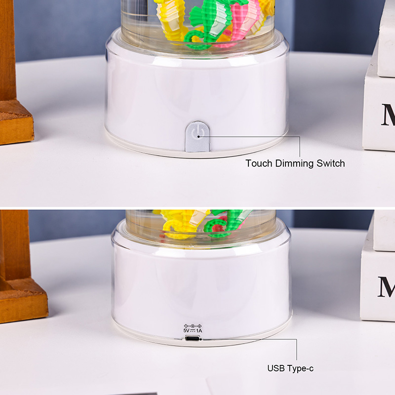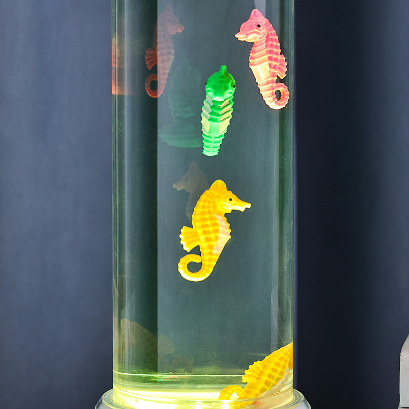 సముద్రపు ప్రశాంతతను కలిగించే మంత్రముగ్ధులను చేసే నీటి అడుగున దృశ్యం మొత్తం యూనిట్ అధిక నాణ్యత కలిగిన మన్నికైన ప్లాస్టిక్తో తయారు చేయబడింది, ఇది సురక్షిత స్థిరత్వం మరియు దీర్ఘకాలిక పనితీరును నిర్ధారిస్తుంది, దీపం సుమారు 12 అంగుళాల పొడవు ఉంటుంది, ఇది విషరహిత ద్రవం మరియు రంగురంగుల సముద్ర గుర్రం ఆభరణాలతో నిండిన సొగసైన పారదర్శక గొట్టంతో ఉంటుంది. ప్రశాంతమైన అంతర్గత ప్రసరణ వ్యవస్థ ద్వారా ఆధారితమైన ద్రవ కాలమ్లో సహజమైన సముద్ర జీవితాన్ని పోలి ఉండే సహజమైన ఊగిసలాటను సృష్టిస్తుంది, ఈ సున్నితమైన కదలిక చూడటానికి ఓదార్పునిస్తుంది మరియు ప్రశాంతమైన దృశ్య అనుభవాన్ని అందిస్తూ ఒత్తిడిని తగ్గించడంలో సహాయపడుతుంది