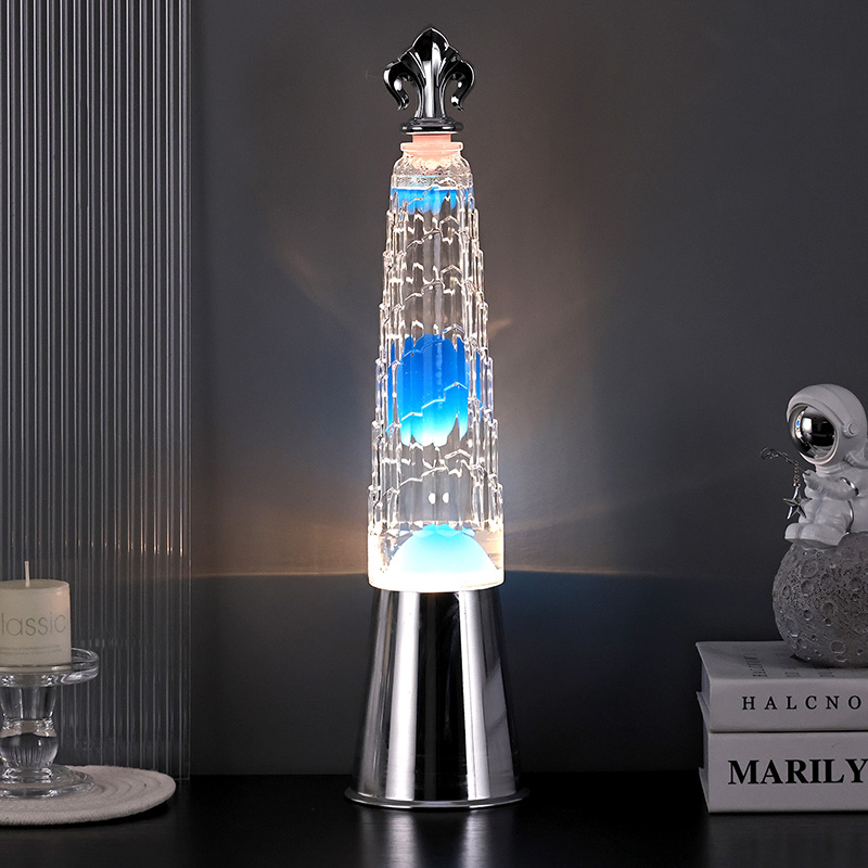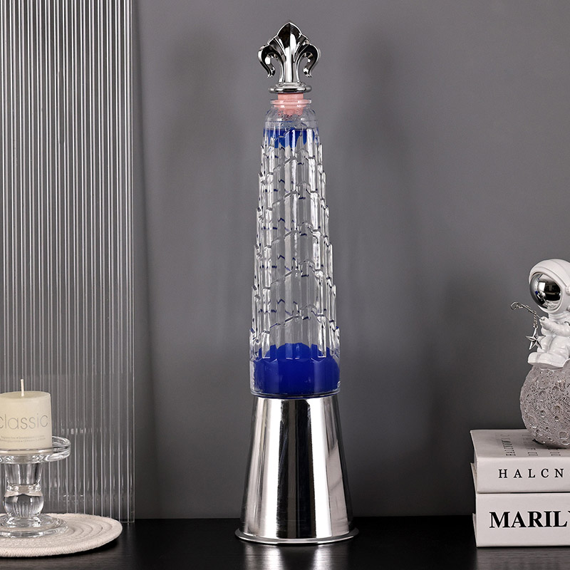 టవర్ షేడ్ లావా ల్యాంప్ టేబుల్ ల్యాంప్ క్లాసిక్ టవర్ ఆకారపు డిజైన్ను కలిగి ఉంది, పైభాగంలో సున్నితమైన బ్లాక్ మెటల్ అలంకరణలు పొందుపరచబడ్డాయి, సరళమైనవి మరియు గొప్పవి. పారదర్శక గాజు సీసా లోపల, నీలం మైనపు ఉంటుంది